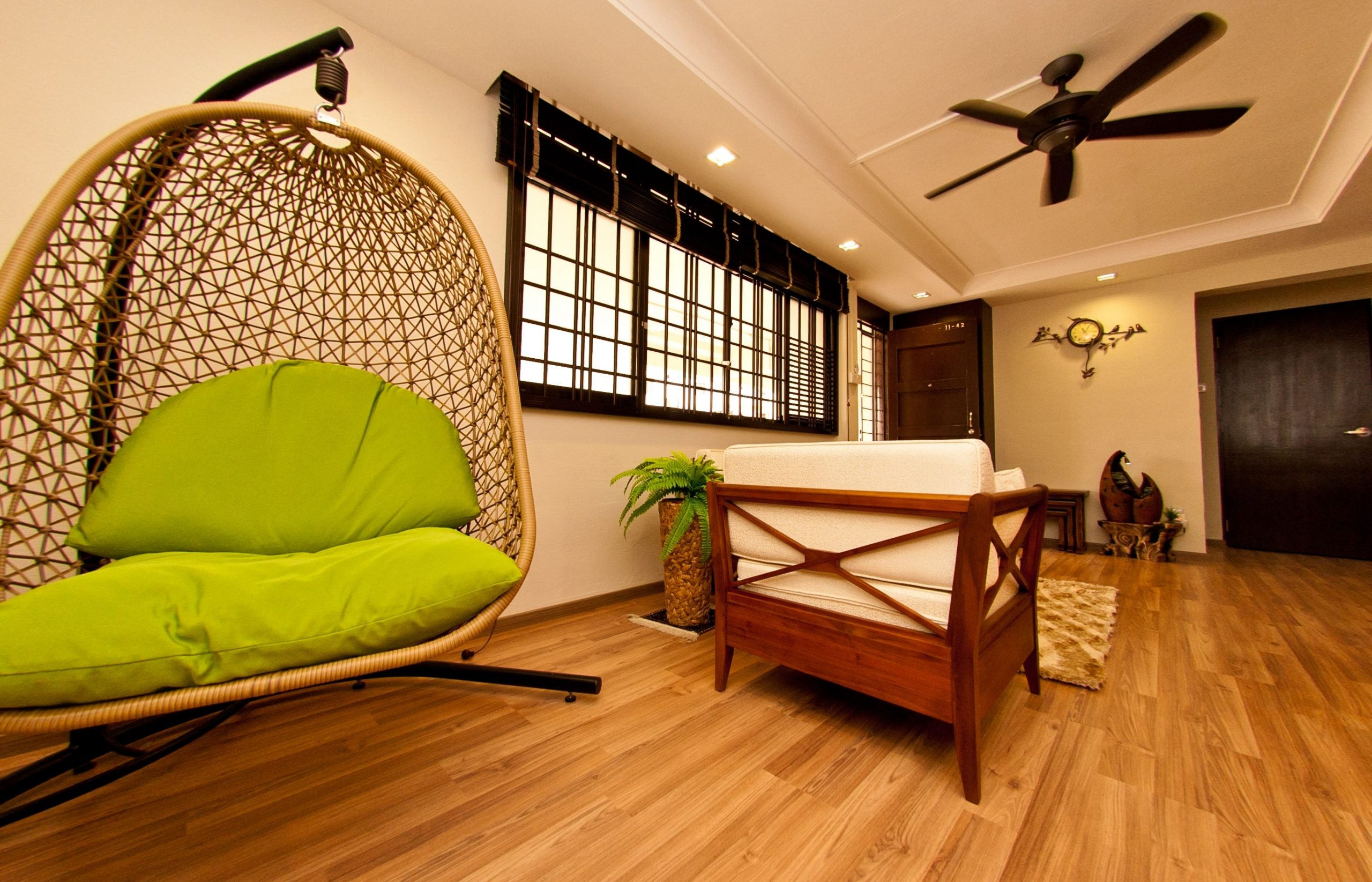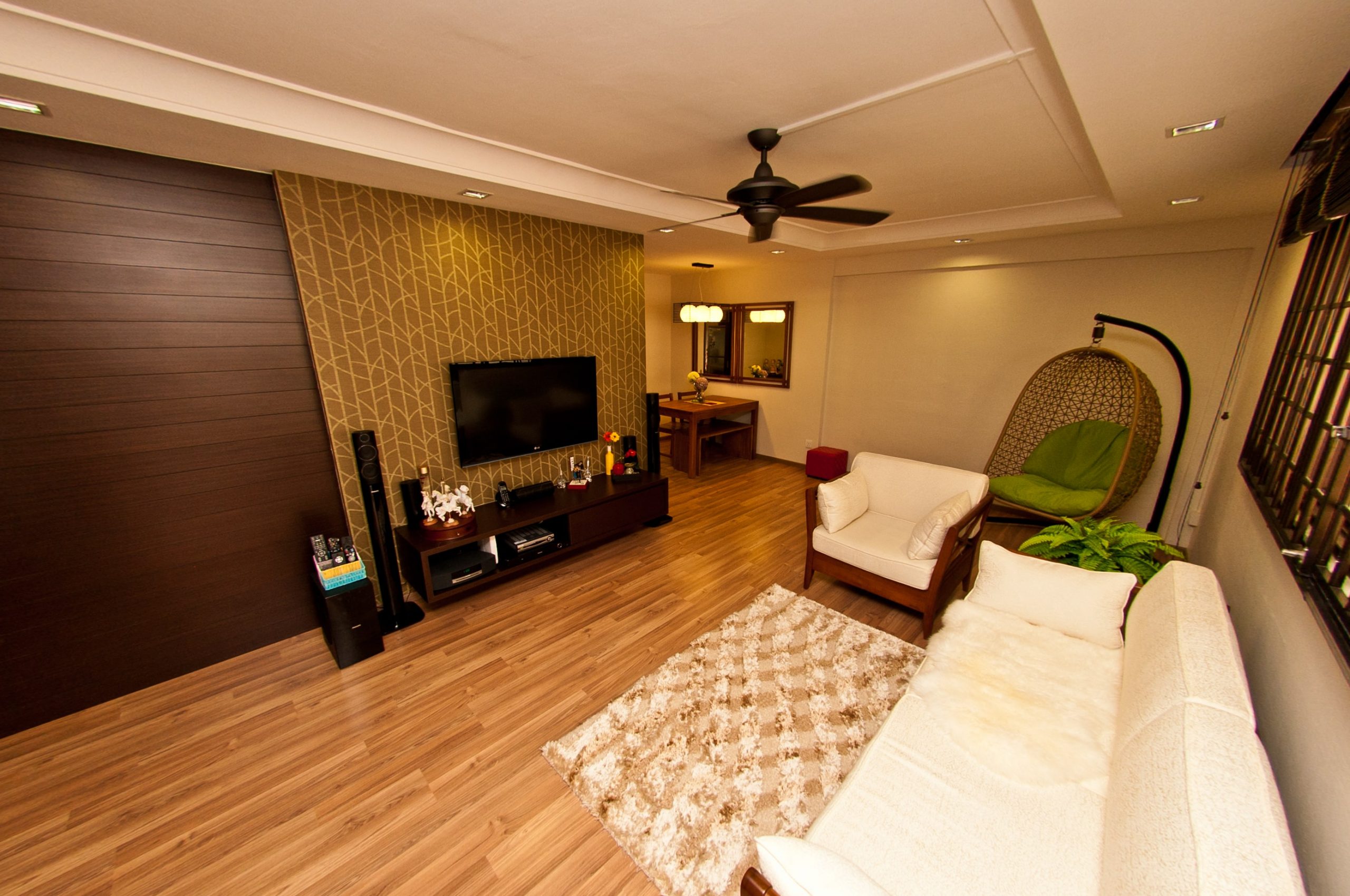 Here’s casual-meets-resort style— Patterned walls accompanied with wood flooring is the perfect design for unwinding and relaxation.