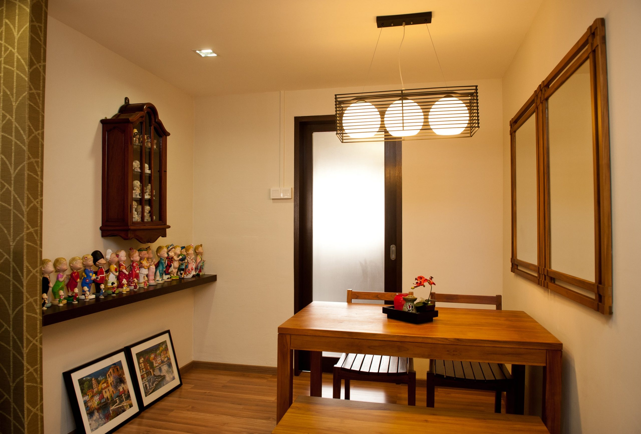 An earthy retreat for the owners— Sturdy wood adds texture to the dining space while warm lights produce calmness to a tranquil place.