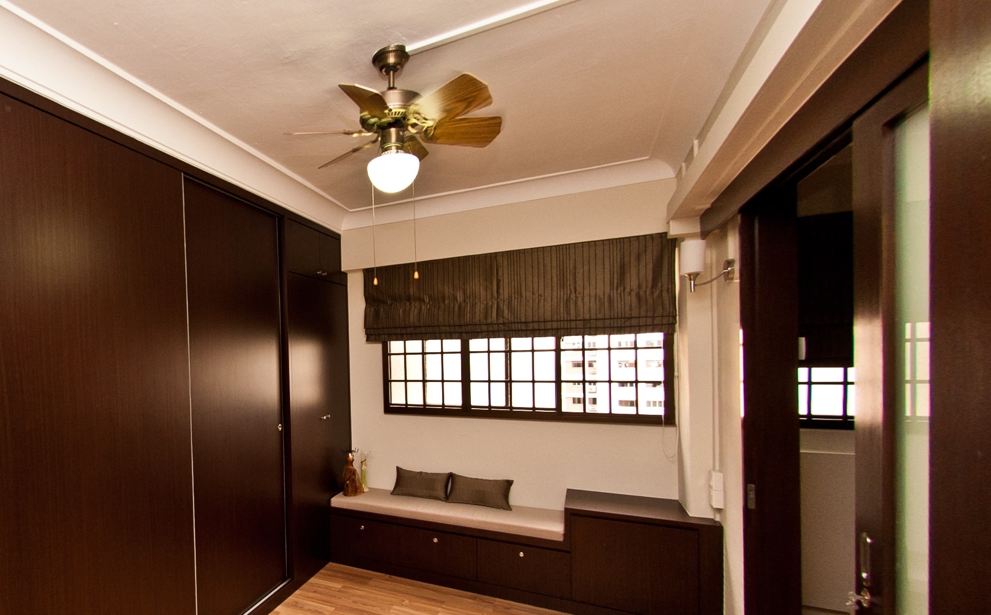 Warm-toned space with dark shades of wood are used as accents to give the space a soothing homely vibe.